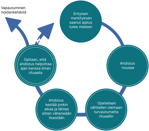 Askel askeleelta välttelyn tilalle opitaan toimivampia tapoja kohdata ahdistus. Samalla opitaan, että ahdistuksentunteesta selviää ilman rituaaleihin turvautumista. Tämä murtaa pakko-oireiden noidankehän.