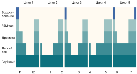 Количество легкого сна в течение ночи увеличивается. При нормальном сне в ночное время происходят кратковременные пробуждения.