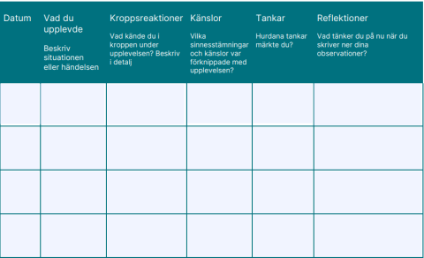 Denna dagboksövning kräver en längre uppföljningsperiod. Vi rekommenderar att du gör övningen i till exempel anteckningarna i din mobiltelefon, ett häfte eller PDF-mallen som du hittar i slutet av uppgiften.