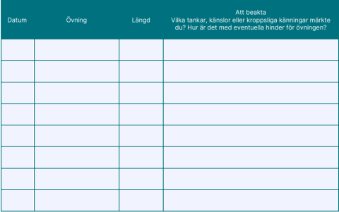 Följ dina övningar med hjälp av en dagbok i till exempel en vecka. Du kan skriva ut vidstående övningsdagbok.