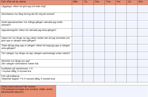 Fyll i sömndagboken med information om natten genast när du vaknat på morgonen. Fyll också i uppgifter om den gångna dagen på kvällarna.