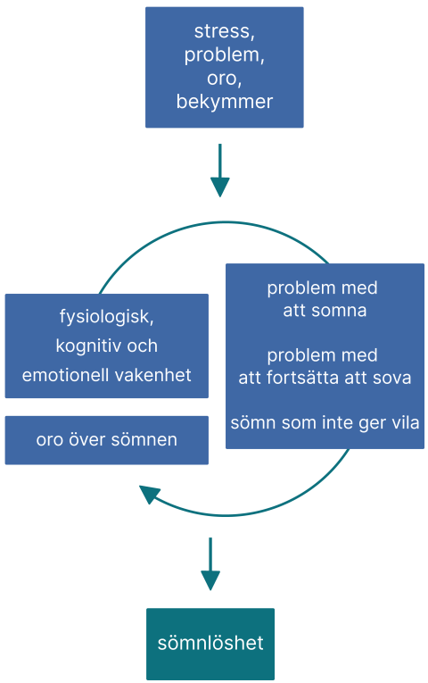 Stress, problem och oro leder till ett tillstånd av överaktivitet. Överaktiviteten gör det svårt att somna och fortsätta sova och försämrar sömnkvaliteten. Dessa leder till oro för sömn, vilket i sin tur upprätthåller överaktiviteten.