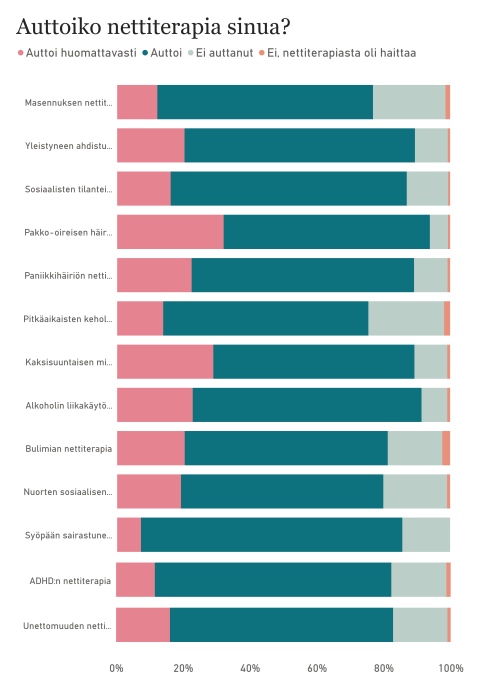 Vain 0,8 % kertoi kokeneensa nettiterapiasta olleen haittaa. Kansainvälinen tutkimus tukee päätelmää, että haitat ovat nettiterapiassa harvinaisempia, kuin vertailuhoidoissa tai potilaan jäädessä ilman hoitoa (Rozental, ym., 2017).