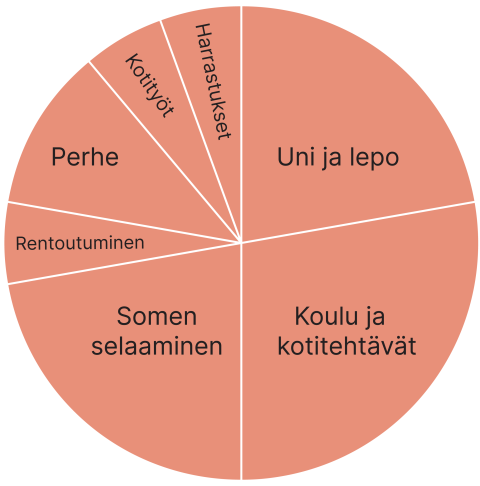 Piirrä yllä olevan kuvan mukainen kuva omasta ajankäytöstäsi. Pohdi, miten ajankäyttö jakaantuu eri asioiden välillä sinulle tyypillisenä päivänä. Voit myös kirjoittaa vastauksesi.