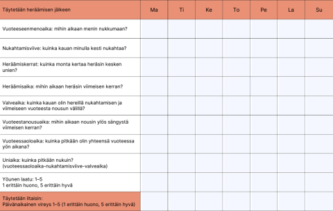 - Aamuisin unipäiväkirjaan täytetään edellisen yön nukkumista koskevat tiedot.