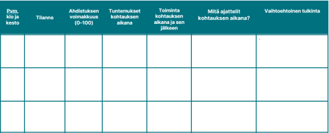 Harjoituksen avulla opit keksimään katastrofitulkintojen tilalle vaihtoehtoisia ja todennäköisempiä tulkintoja sekä seuraamaan voinnissasi tapahtuvia muutoksia.