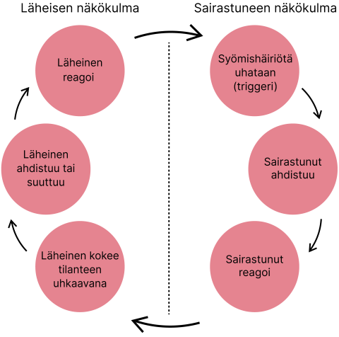 Syömishäiriökäyttäytyminen voi johtaa noidankehään. Siinä sairastunut ja läheinen reagoivat vuorotellen, kunnes tilanne räjähtää.