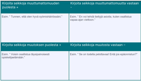 Tämän kautta ymmärrät paremmin, mitkä asiat estävät muutosta. Näin sinun on helpompi miettiä, mitä niille voisi tehdä.