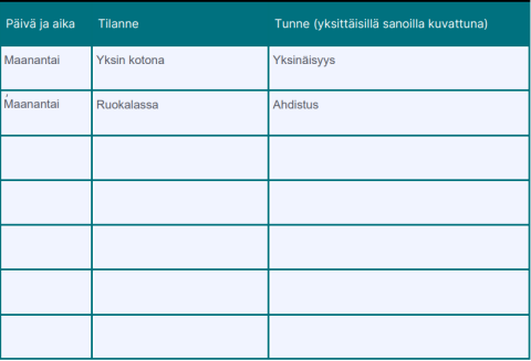 Pidä muutaman päivän ajan tunnepäiväkirjaa. Kirjaa sellaisia tilanteita, joissa erilaisia tunteita nousee. Tunteet saattavat aluksi tuntua epämääräisiltä tai pelottavilta. Kun pidät kirjaa tunteistasi, tutustut ja samalla totut niihin.