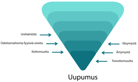 Usein tunnollisille ihmisille käy niin, että vastuut lisääntyvät ja aikaa tehtäville nipistetään mielihyvää tuottavista tekemisistä. Elämän kaventuessa myös masennukseen liittyvät oireet vähitellen lisääntyvät. Tätä voidaan kuvata uupumuksen suppilolla: