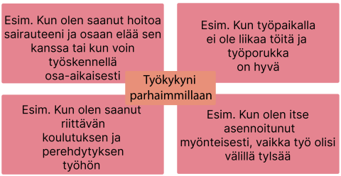 Tutki alla olevaa kuvaa. Mieti sen pohjalta, mitkä asiat edistävät työkykyäsi. Kirjaa ylös, milloin työkykysi on parhaimmillaan.