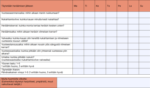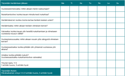 Täytä unipäiväkirjaan heti aamulla herättyäsi tietoja yöstä. Täytä myös iltaisin tietoja kuluneesta päivästä.