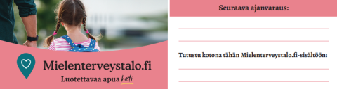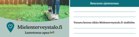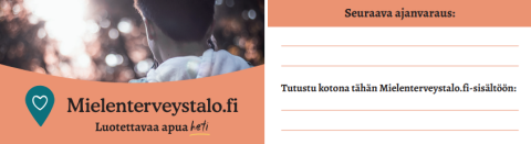 Ajanvarauskorttiin voi seuraavan tapaamisajan lisäksi kirjoittaa, mihin sisältöihin asiakkaan kannattaa tutustua. Kortit ovat kaksipuolisia ja käyntikortin kokoisia.