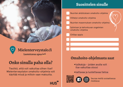 Materiaalit, joissa ei ole logoa, saa pyydettäessä osoitteesta info.mielenterveystalo@hus.fi. Sopikaa logon vaihdosta käyttämänne painotalon kanssa. Painotaloon kannattaa lähettää nähtäviksi myös ne versiot, joissa on HUS-logo. Niistä he näkevät oikean paikan logolle.
