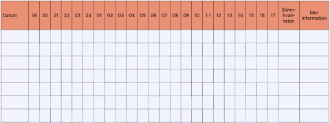 En sömndagbok hjälper till att bedöma och bygga upp en regelbunden rytm. Med hjälp av sömndagboken kan du också planera ändringar i dagssömn- och nattsömnrytmen och följa upp sömnmängden under veckan.