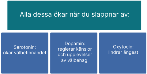 När du slappnar av startar många kemiska processer i kroppen som främjar välbefinnandet. Avslappningen ökar till exempel utsöndringen av serotonin, som ökar välbefinnandet; dopamin, som ingår i hjärnans belöningssystem; samt oxytocin, som lindrar ångest. Därför bör man medvetet planera in avkopplande stunder under dagen.