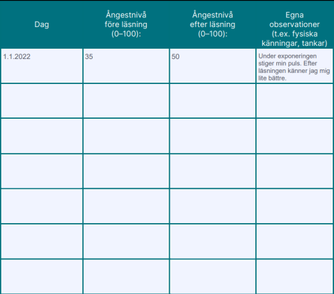 Läs beskrivningen av din rädsla högt 1–3 gånger om dagen. Upprepa i minst tre dagar för att bli van. Du kan också spela in beskrivningen till exempel på din mobiltelefon och lyssna på inspelningen.
