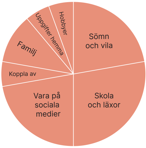 Rita en bild av din egen tidsanvändning enligt bilden ovan. Fundera på hur din tid fördelas mellan olika saker en vanlig dag. Du kan också skriva ner ditt svar.