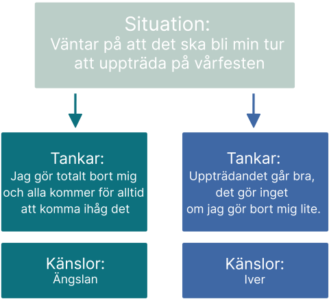 I liknande situationer kan det uppstå olika känslor, beroende på vad du tänker. Det är viktigt att stanna upp och fundera på vilken typ av tankar du har i ditt psyke och vilka känslor de åstadkommer.